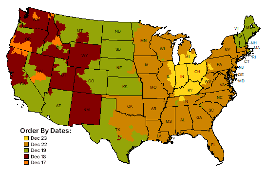 Find your area and match the color to determine the cut off Date for Christmas Delivery!