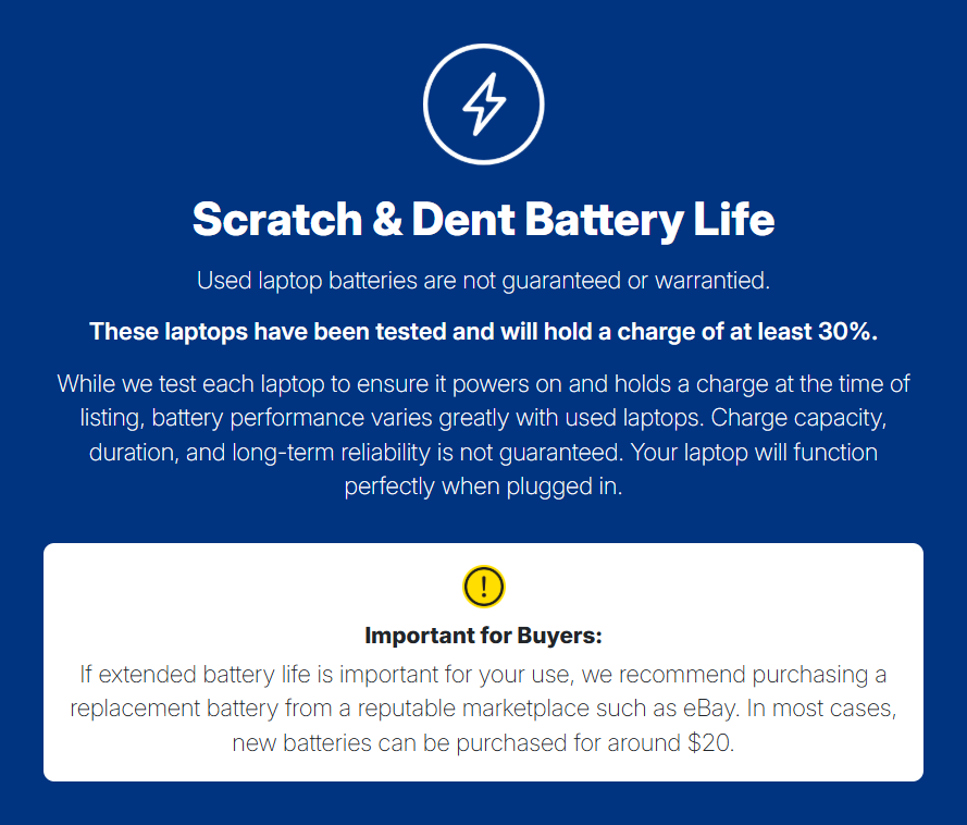 - Important Note: We do not provide warranty or guarantee for laptop batteries. Refurbished machines will include used batteries, which typically have limited lifespans. While we do not test laptop batteries, we ensure the laptop's functionality using the included AC adapter.
