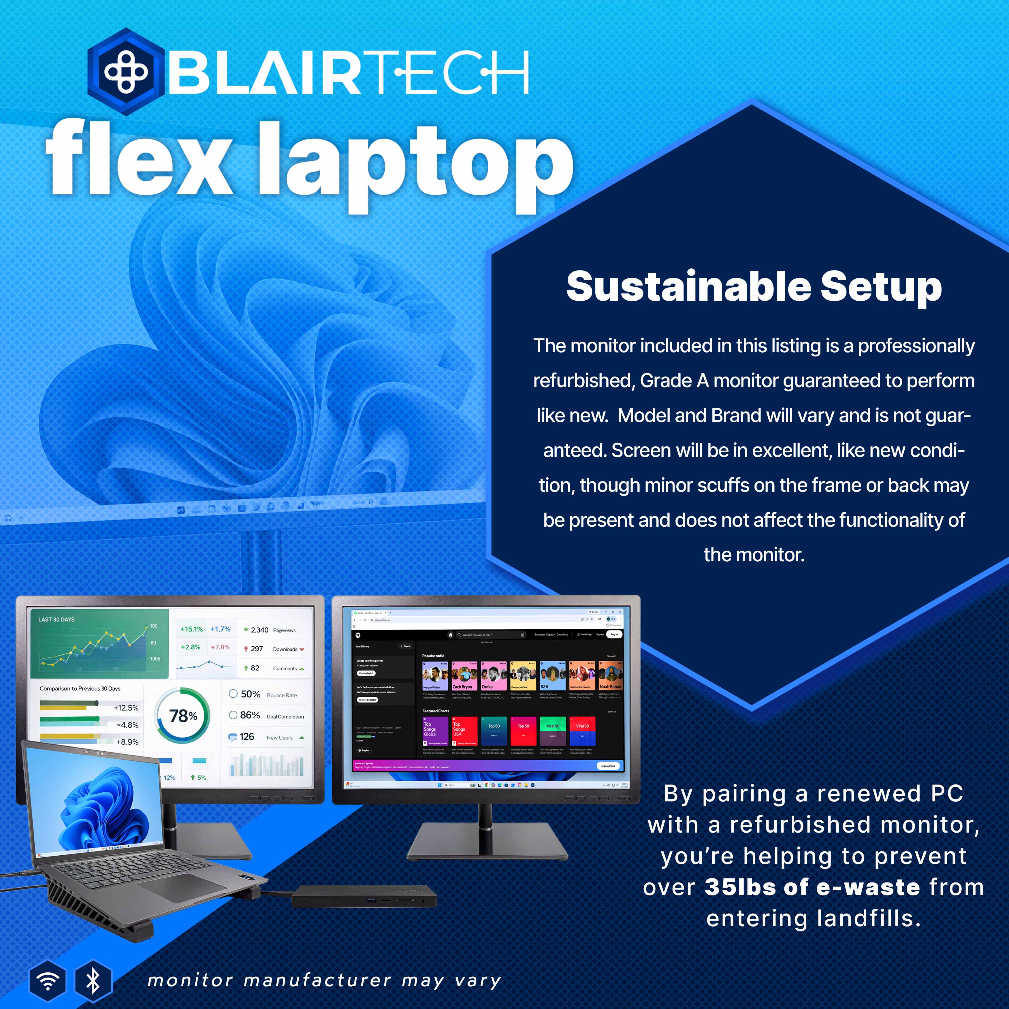 Designed for power users and multitaskers, the Flex Professional Bundle transforms your laptop into a true multi-screen workstation. With dual 24” renewed monitors and extended display support, you can work across three screens simultaneously, perfect for spreadsheets, creative projects, meetings, and multitasking.