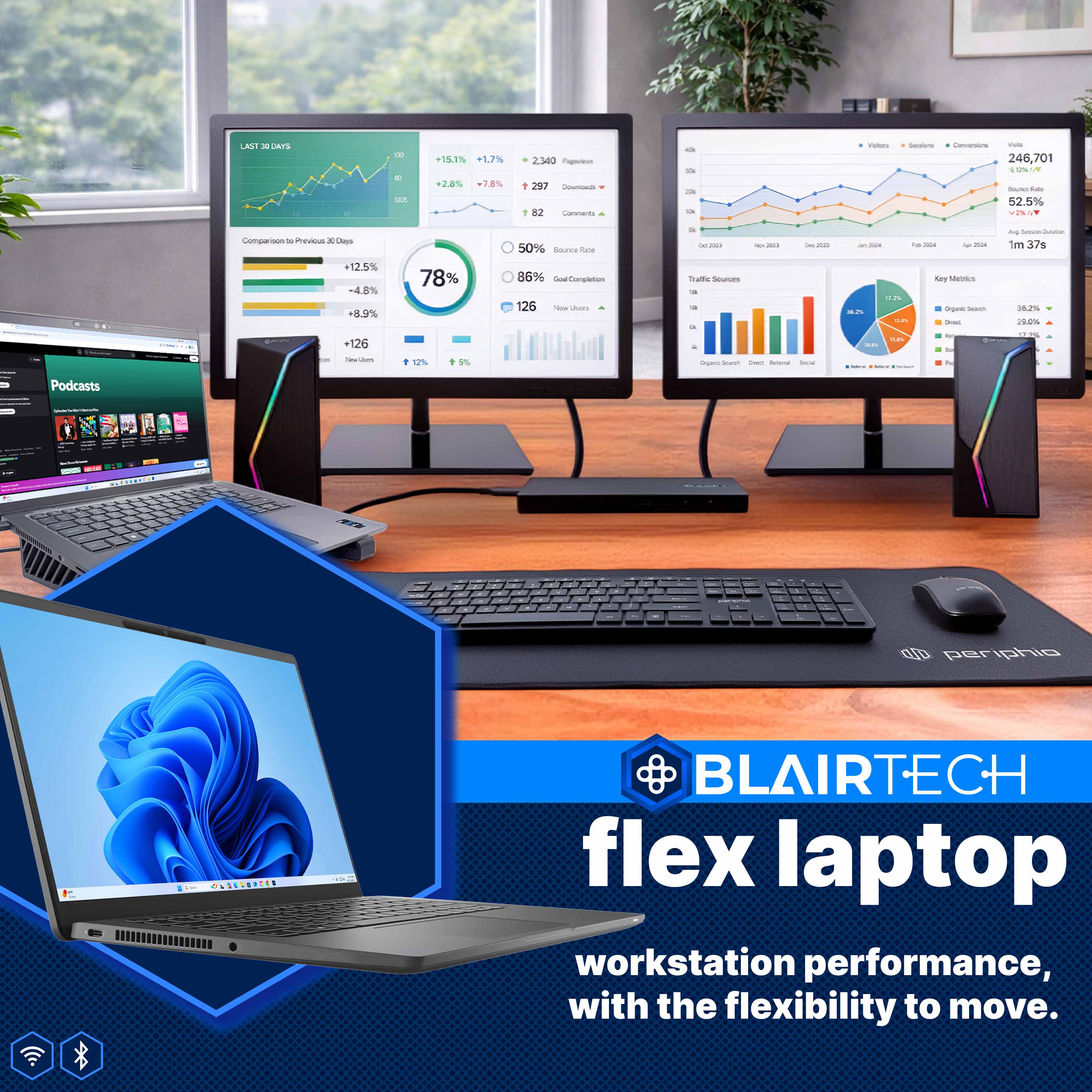 Includes the BlairTech Flex laptop, dual monitors, wireless mouse & keyboard, RGB speakers, desk mat, cooling stand, and a 100W USB-C hub to connect it all — professionally configured, fully compatible, and ready to work!