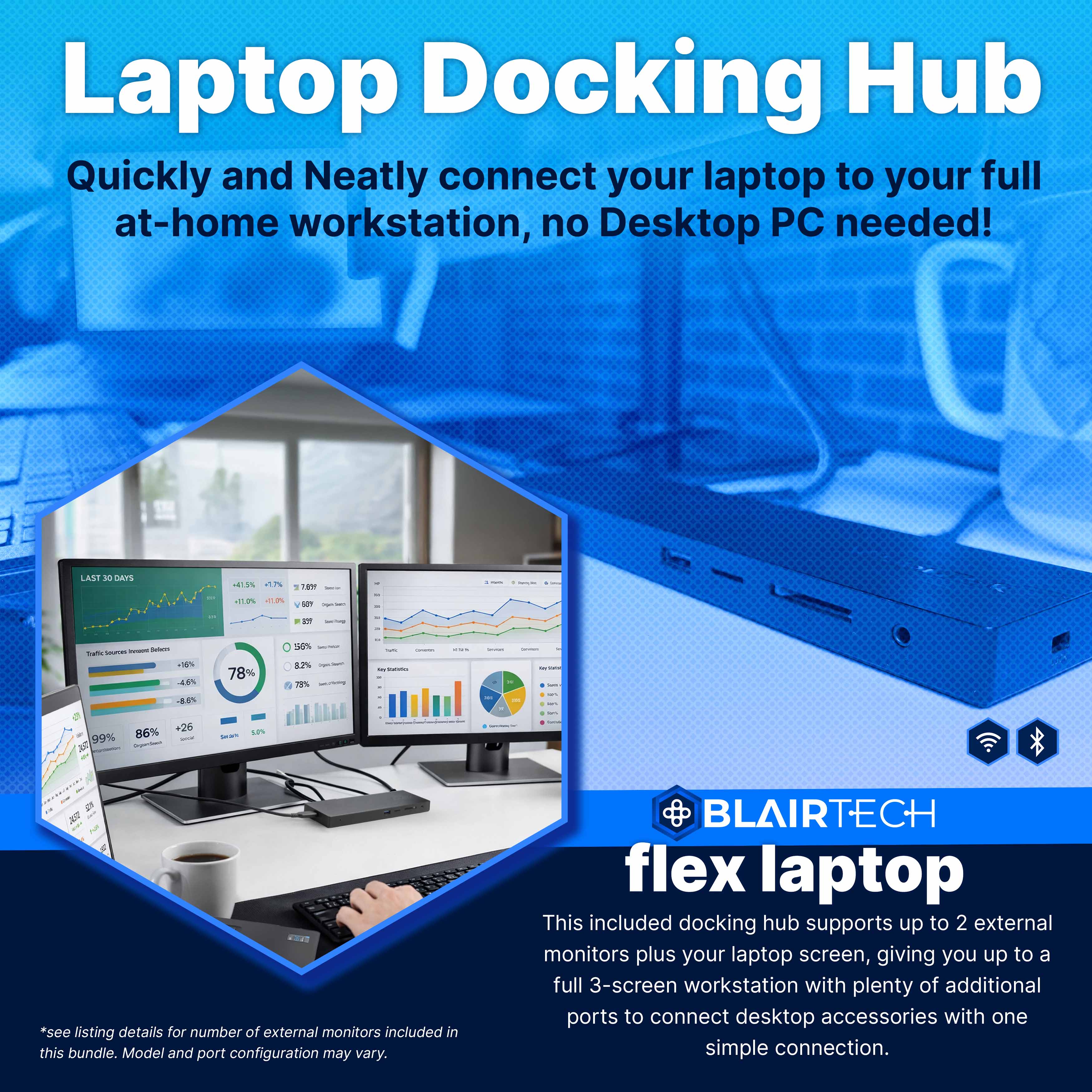 At the center of every BlairTech Flex bundle is a powerful 100W USB-C docking hub designed to transform your laptop into a full workstation. With a single cable connection, the hub powers your laptop while expanding your connectivity.