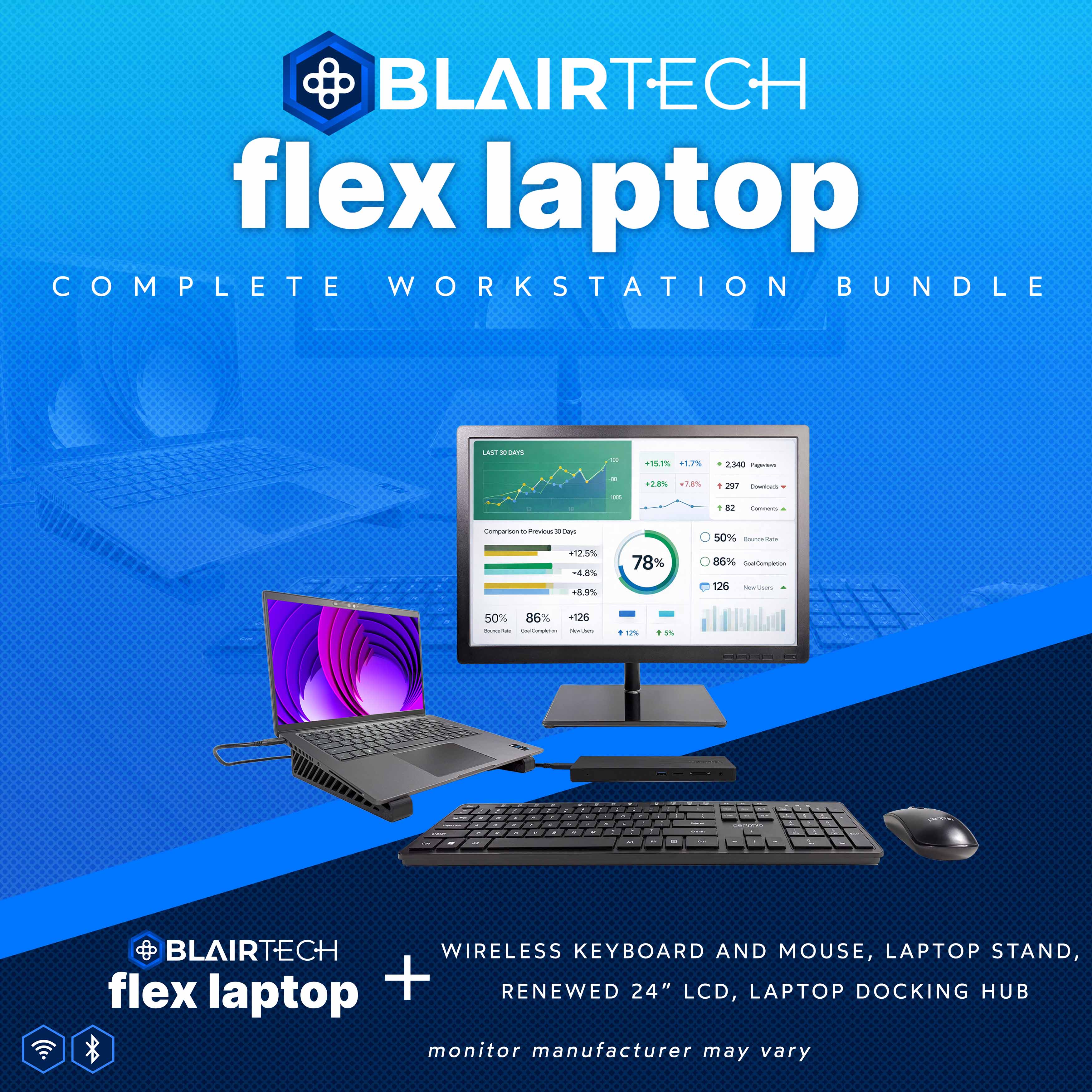 Includes the BlairTech Flex laptop, dual monitors, wireless mouse & keyboard, RGB speakers, desk mat, cooling stand, and a 100W USB-C hub to connect it all — professionally configured, fully compatible, and ready to work!